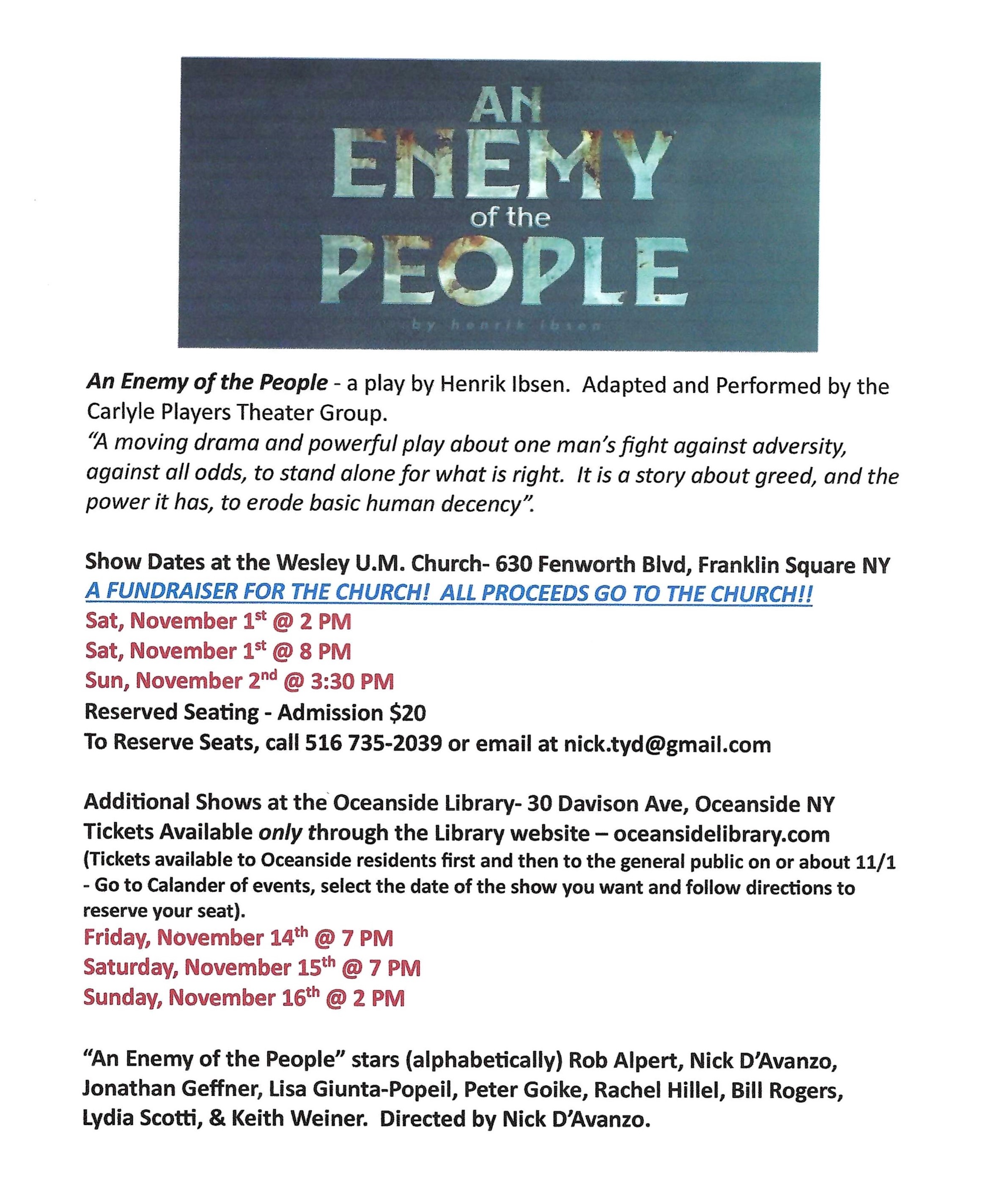 An Enemy of the People" written by Henrik Ibsen and Adapted by the Carlyle Players is a moving drama and powerful play about one man's fight against adversity, against all odds, to stand alone for what is right. It is a story about greed, and the power it has to erode basic human decency.