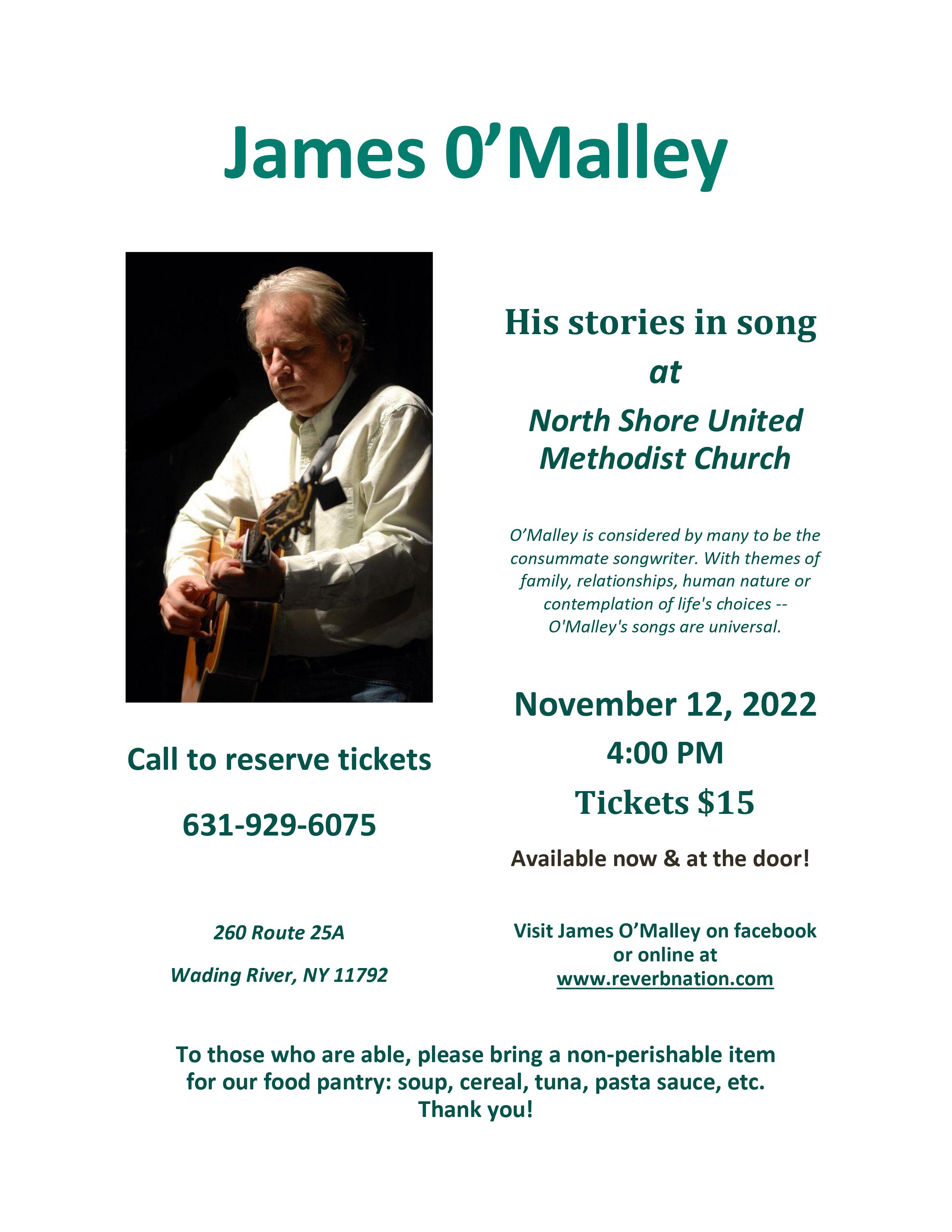 DescriptionJames O’Malley is a hugely talented lyricist and musician who writes knowingly of life’s foibles, triumphs and defeats. He delivers his songs in a subtle, whispering tenor that completely draws the listener into the story he is telling. Considered by many to be the consummate songwriter, O’Malley writes songs that take the listener on an emotional journey exploring family, relationships, human nature and the contemplation of life's choices. Critics praise the New York area artist’s warm melodies, story-telling abilities and his way of charming audiences. O'Malley's songs are universal, often written with a subtle humor.